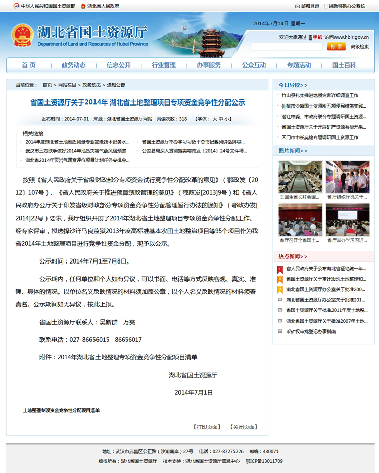 省國土資源廳關于2014年 湖北省土地整理項目專項資金競爭性分配公示