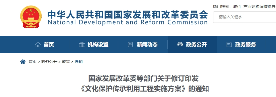 日前,國家發展改革委會同住房城鄉建設部、中央宣傳部、文化和旅游部等部門對《文化保護傳承利用工程實施方案》進行了修訂。