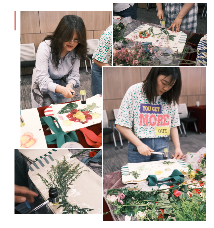 活動現場充滿了歡聲笑語,大家紛紛使出“洪荒之力”,咚咚咚…….伴隨著細碎的敲擊聲和花草香,一幅幅色彩斑斕的植物圖案躍然紙上。