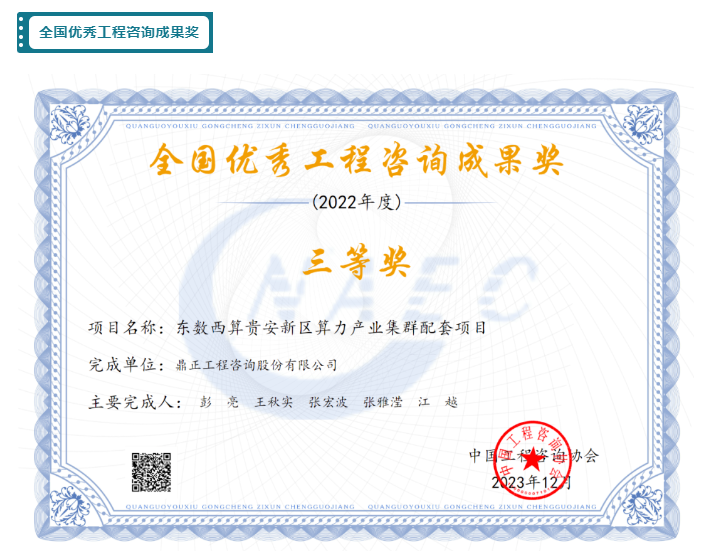 東數西算貴安新區算力產業集群配套項目榮獲全國優秀工程咨詢成果獎三等獎。