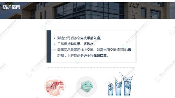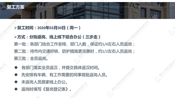 分批返崗、線上線下結合辦公,鼎正人的復工準備工作正有序進行。在疫情防控、復工復產兩手抓的同時,鼎正咨詢將一如既往地為客戶提供專業的全過程工程咨詢服務