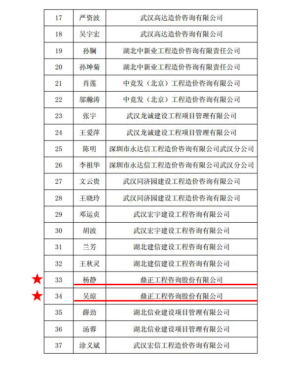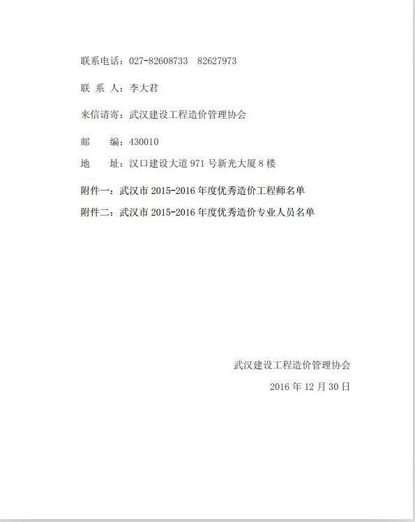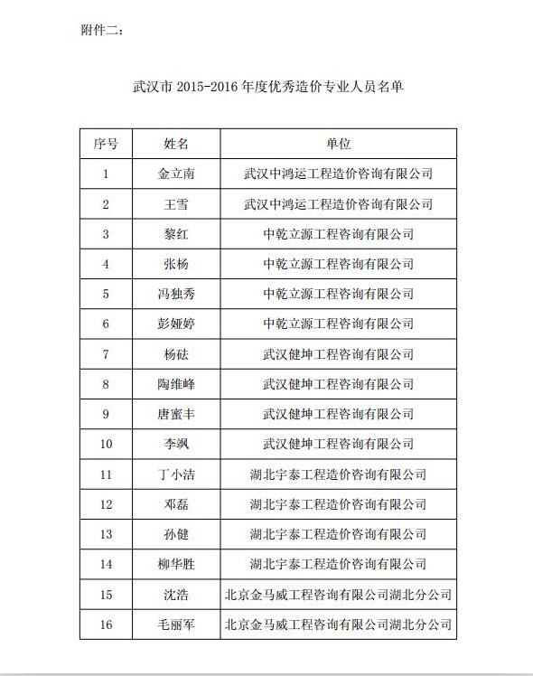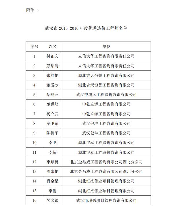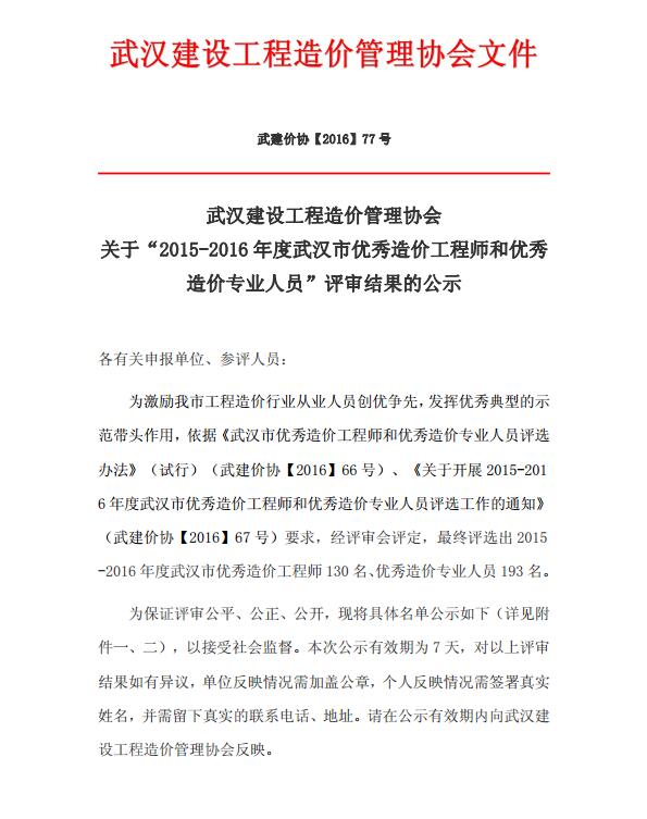 我司多名員工榮獲2015-2016年度武漢市“優秀造價工程師”、“優秀造價專業人員 ”稱號
